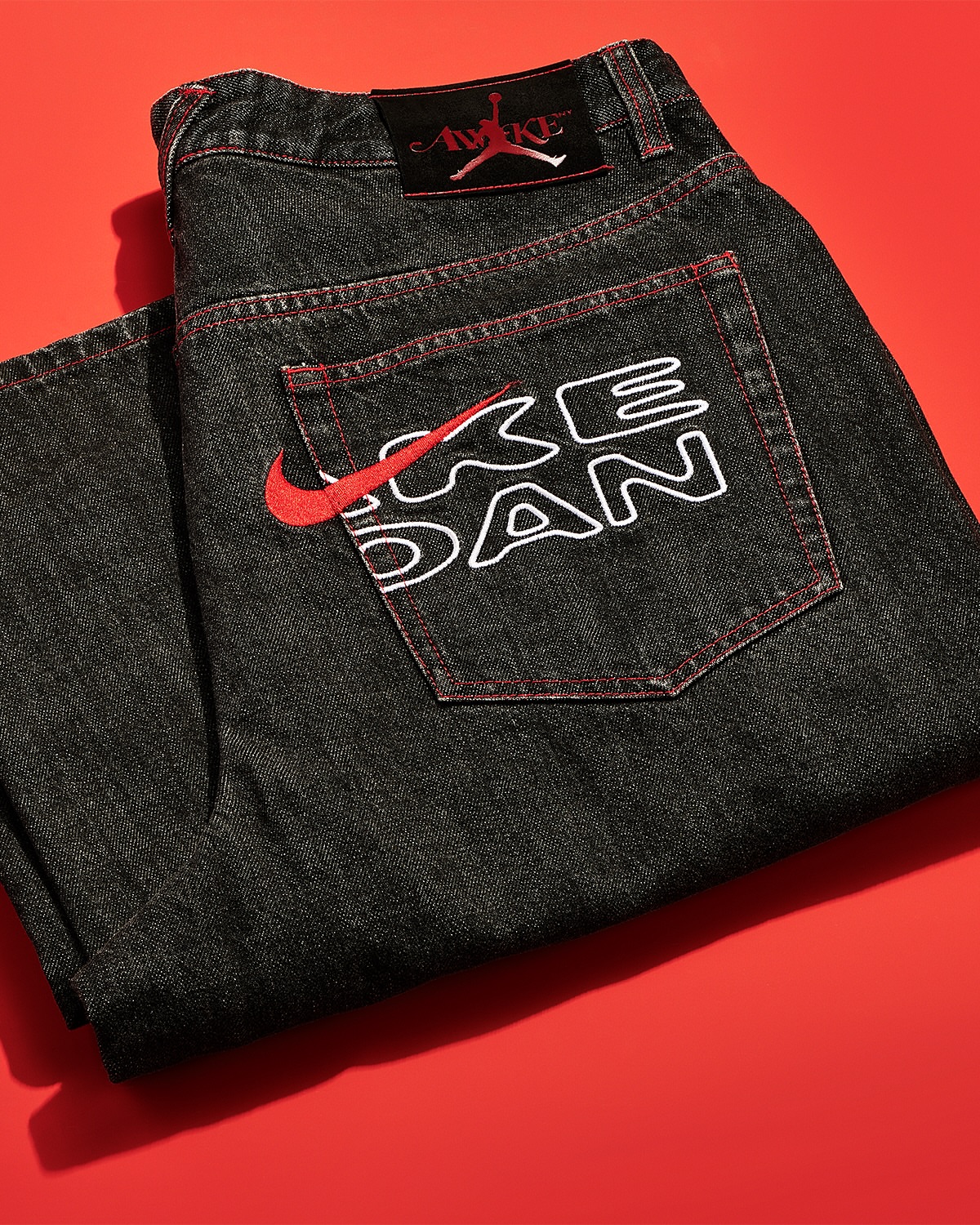 Signature details include embroidered branding, custom rivets, and a leather logo patch on the back waistband