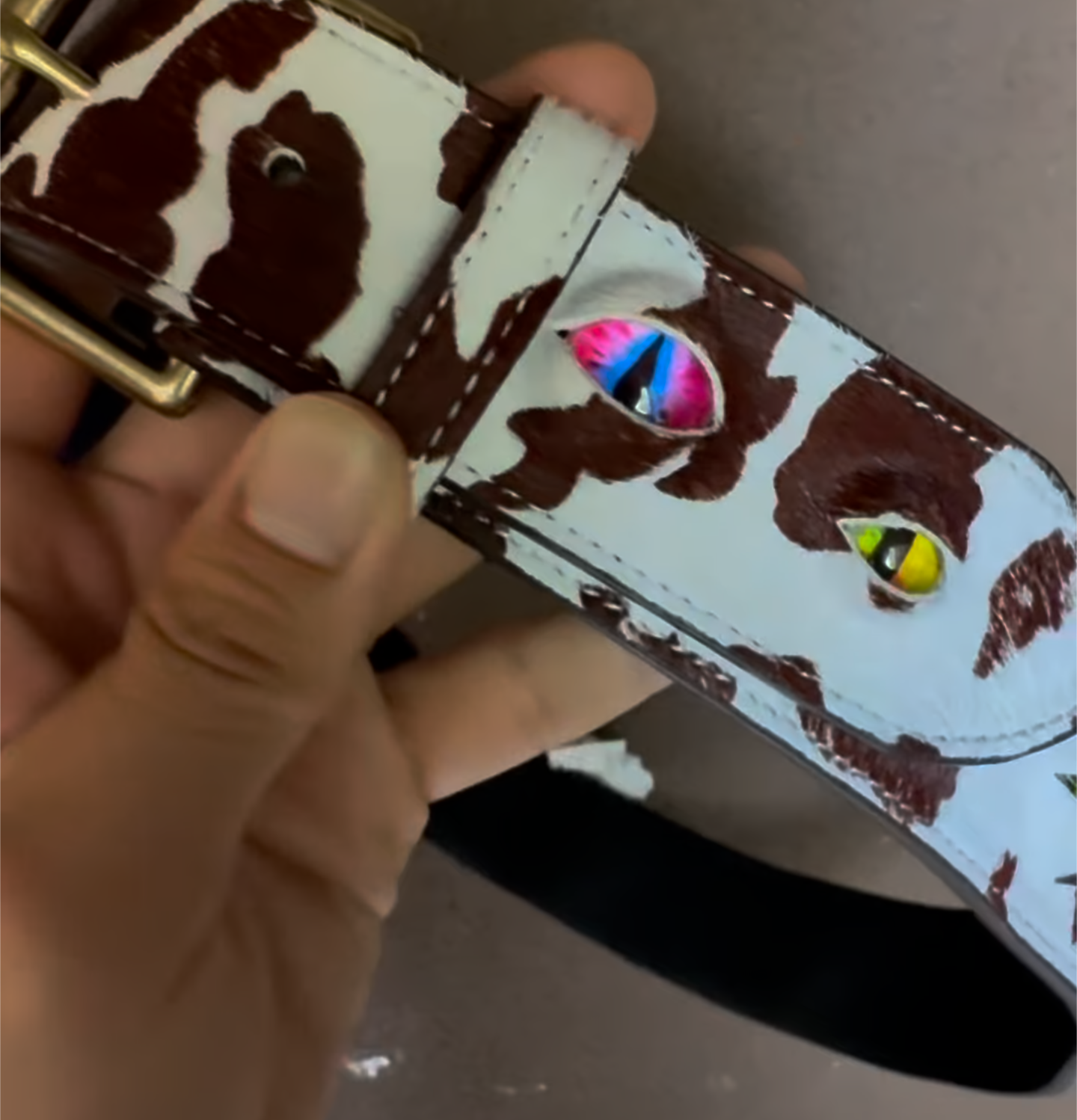 The term “cow-eyed belt” isn’t a widely recognized or official name within fashion catalogs—but it likely refers to belts that feature cow-print patterns, embracing either hair-on-hide or printed cowhide aesthetics. These styles follow the renewed trend of animal-print accessories but with a rustic, eye-catching twist.