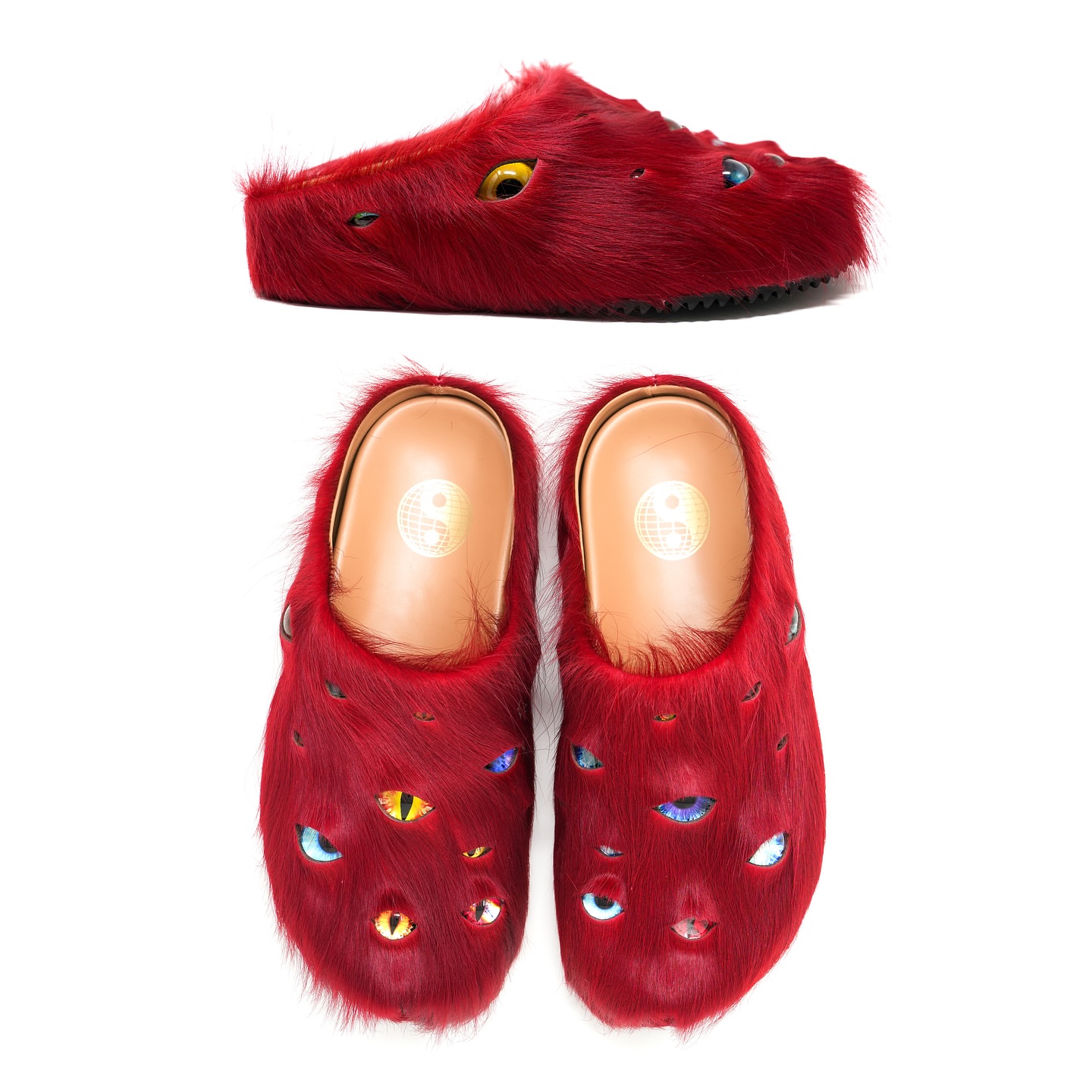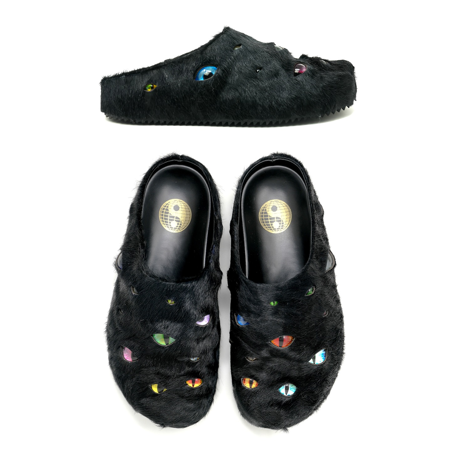 These striking mules are from ESENES WORLDWIDE, a brand known for its avant-garde footwear designs. The Eyeball Mules feature: