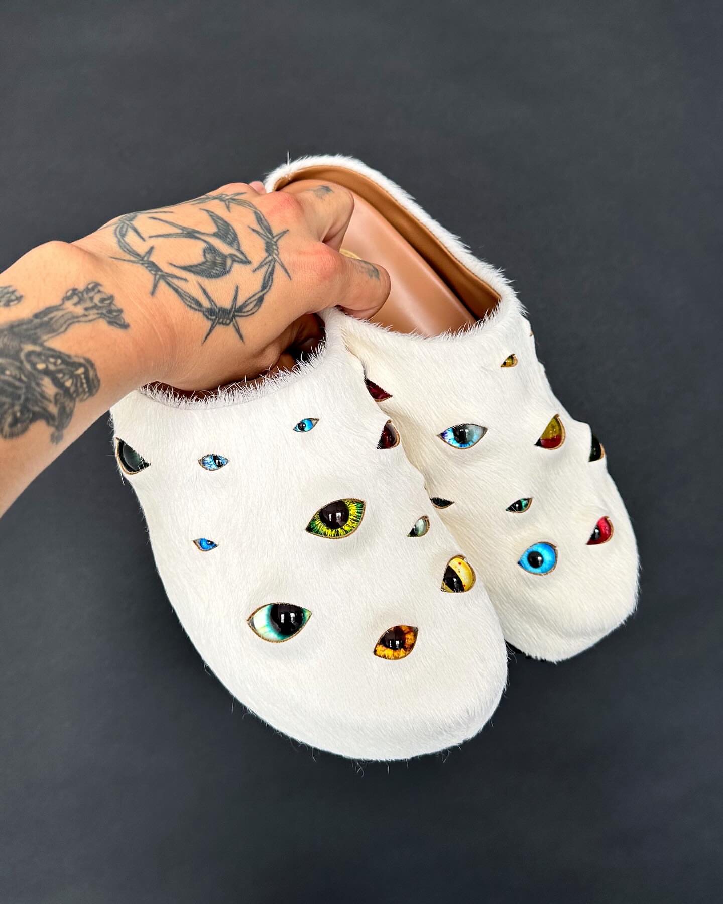 Here’s what “Eyesball Mules” (or Eyeball Mules) look like—quirky, bold slip-ons featuring handcrafted glass eyes scattered across the upper for an artful, surreal vibe.