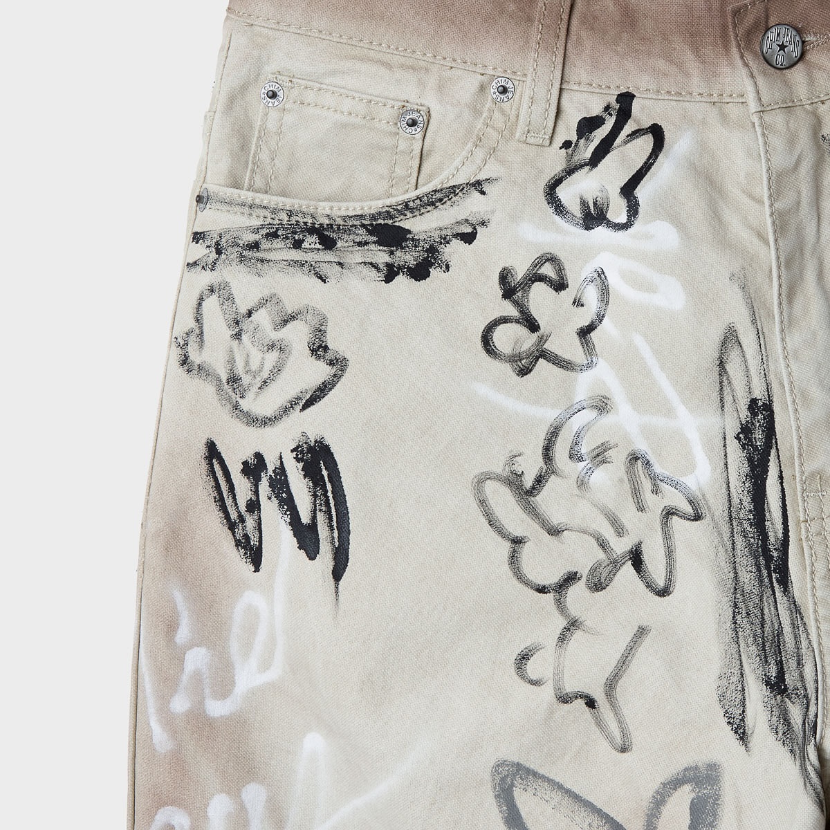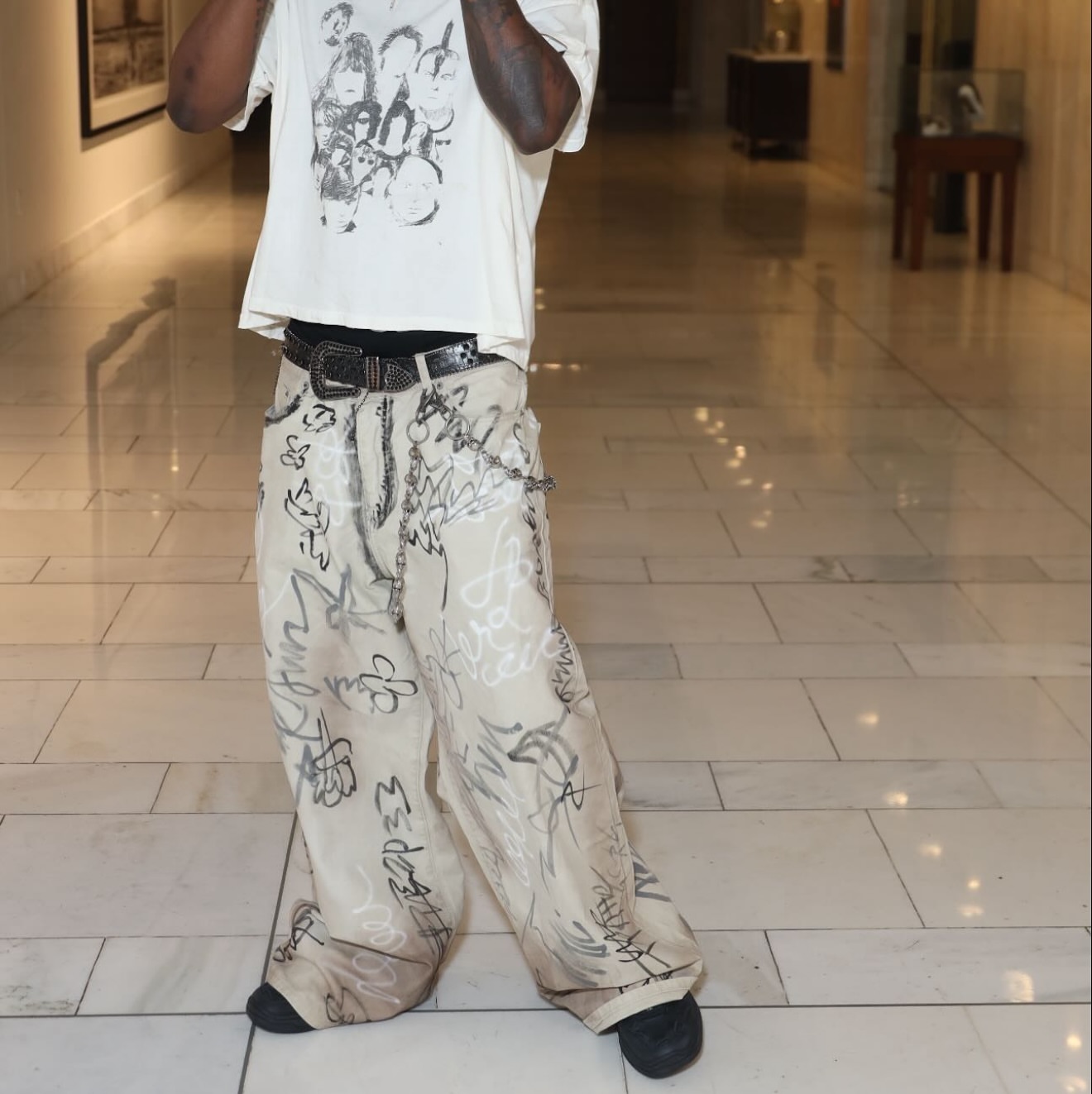 Graffiti Chinos marry the classic structure of chino pants—think cotton twill, tailored fits, and clean lines—with urban graffiti aesthetics. These styles offer a bold twist to casual wear, drawing inspiration from street-style culture and customized, one-off visuals.