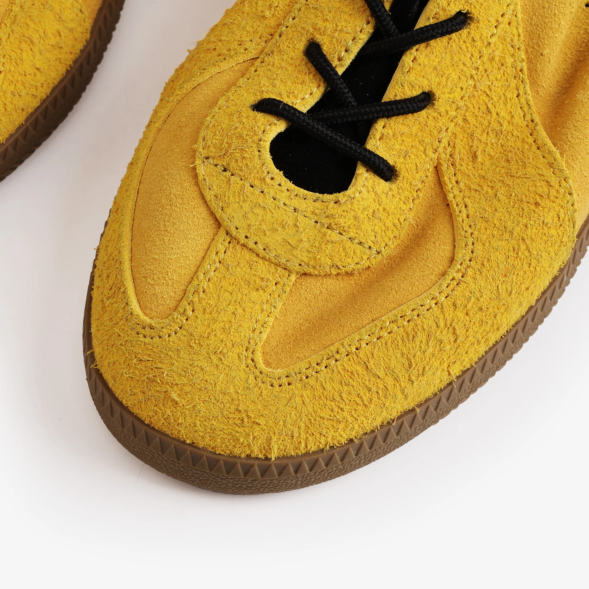 Waxed leather, smooth suede, vegetable-tanned leather, and split suede paneling for a refined texture. Half-latex support insole adds stability and comfort, while the vintage-finished outsole lends a retro touch. Comes with black nylon round laces and yellow–purple dotted round laces for versatile styling.