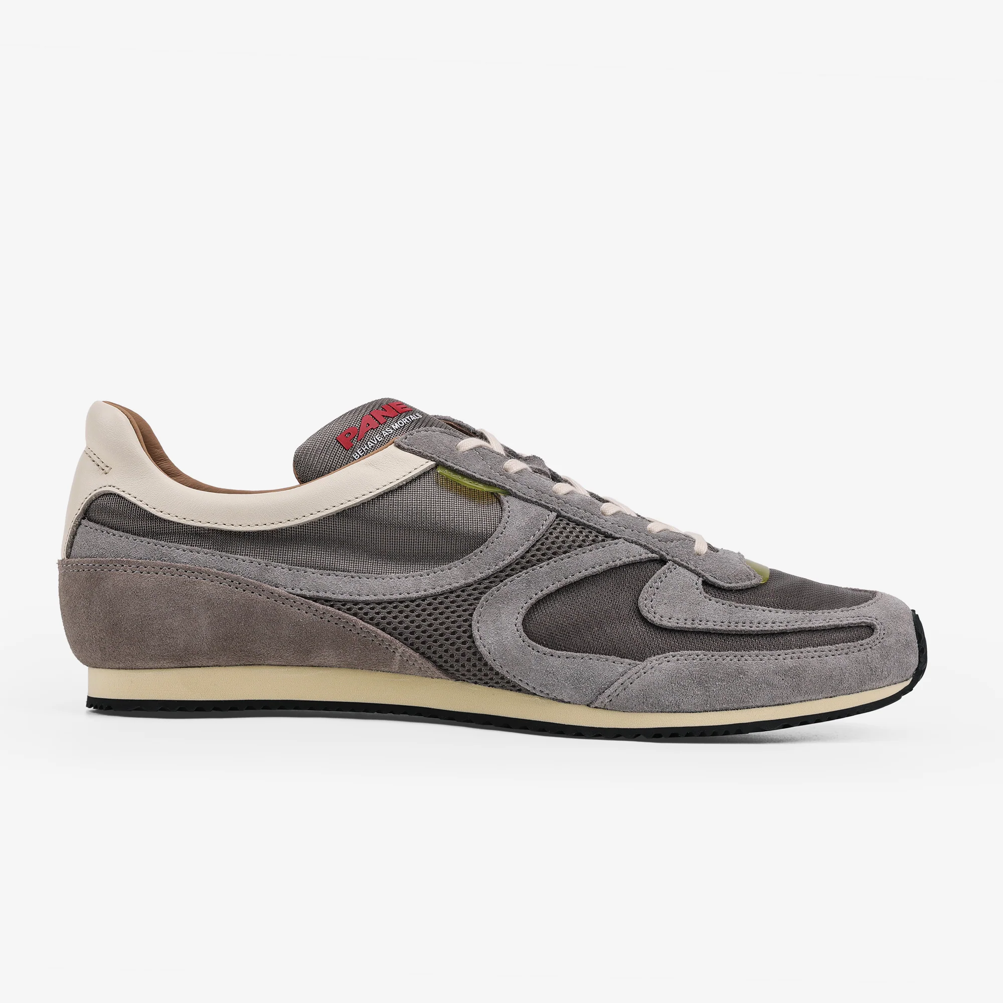 Bay Shore Grey Goose colorway with layered gradients of grey, accented by a reflective lace system. Nappa leather, suede, glossy nylon, and sandwich mesh combine in a lightweight low-profile design with Canberra material for added breathability. Finished with an ultra-thin rubber outsole and two lace options—off-white cotton (4mm) and off-white reflective with silver dots (3mm).
