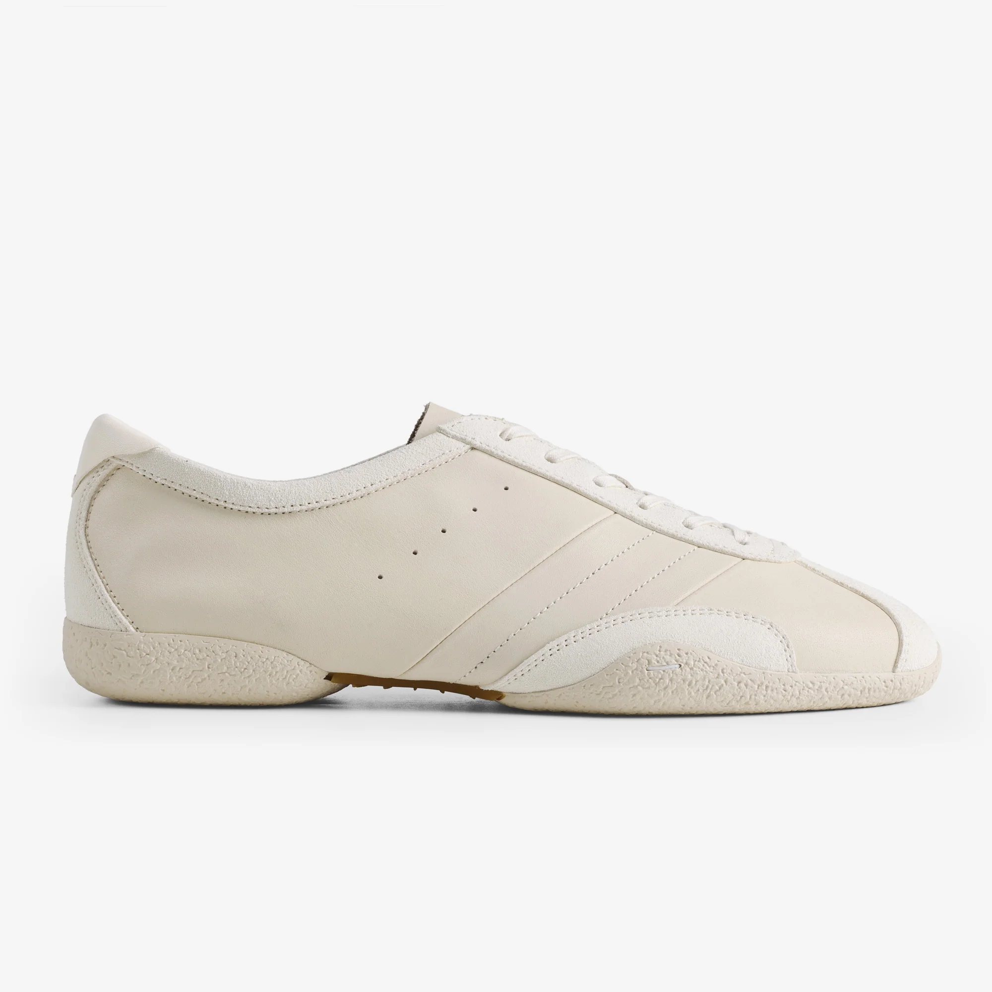 Washed wax-textured leather, suede, and chrome-free leather in pure white create a soft, refined finish. Unlined construction highlights the authentic feel of leather—supple yet supportive. Leather-faced insole with 5mm Ortholite and a cork midsole enhances comfort, while the updated one-piece rubber outsole offers a softer, foot-hugging fit. The elongated, arch-tapered silhouette completes the elegant profile.